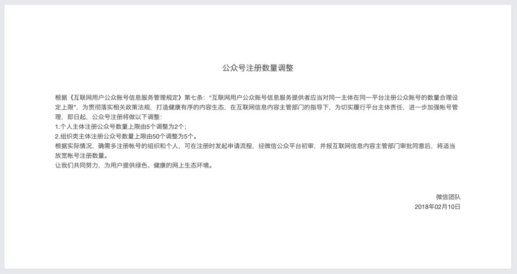 微信调整公众号注册数量:个人限 2 个,组织限 5 个